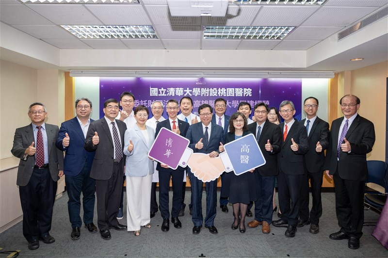 清華大學附設桃園醫院將委託高雄醫學大學興建經營,兩校4日在台大校友會館舉行簽約儀式,行政院副院長鄭文燦(右6)、財政部長莊翠雲(左4)、清華大學校長高為元(左5)等人出席。圖/清大提供