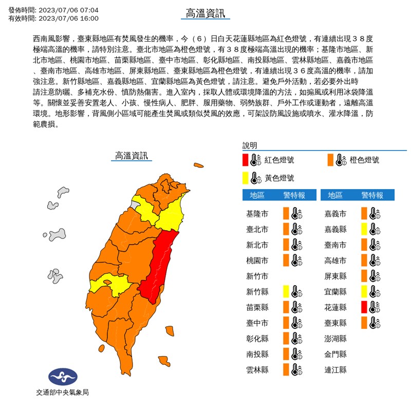 留意連續高溫 9日前白天高溫時間再延長 |2023.07.06 語音朗讀 1217觀看次 字級 大 中 小 圖/取自中央氣象局官網圖為5日民眾撐傘在高雄大港橋附近遊憩。圖/中央社 【本報台北訊】氣象局今(6)日除新竹市外發布全台高溫資訊,其中花蓮縣、台北市有機會達攝氏38度以上。氣象專家彭啟明表示,昨(5)日北市持續7小時氣溫都在至少35度,9日前中北部白天高溫時間可能再延長。中央氣象局今(6)日發布高溫資訊,西南風影響,台東縣地區有焚風發生的機率,白天花蓮縣為紅色燈號,有連續出現38度極端高溫的機率;台北市為橙色燈號,有38度極端高溫出現的機率。基隆市、新北市、桃園市、苗栗縣、台中市、彰化縣、南投縣、雲林縣、嘉義市、台南市地區、高雄市、屏東縣、台東縣為橙色燈號,有連續出現36度高溫的機率;新竹縣、嘉義縣、宜蘭縣為黃色燈號,預估氣溫達36度以上 。天氣風險公司總經理彭啟明今(6)日在臉書表示,以台北站為例,從5日上午9時到下午4時,7個小時內溫度一直保持在至少35度;午後山區熱對流雨量比前一天更少,呈現穩定的高溫趨勢。彭啟明指出,今(6)日至9日,受太平洋高壓和西南風影響,將持續高溫天氣,西南風水氣較少,只有在清晨到上午,中南部沿海地區有零星降雨機會,午後山區有局部對流雨;由於乾熱空氣將順著太平洋高壓流動到台灣北部,中北部白天高溫時間可能再延長。彭啟明提到,預估9日下午風向可能會轉成西南風,午後山區的對流雨會更多;下周太平洋高壓力將北移,南邊的不穩定波動、東南風水氣可能會往台灣移動,即使高溫狀況與本周相比不高,仍然偏熱,午後的對流雨會較活躍,可能會往西半部平地移動,天氣不太穩定。氣象局6日除新竹市外發布全台高溫資訊,其中花蓮縣、台北市有機會達攝氏38度以上。圖/取自中央氣象局官網 前一篇文章 新聞千里眼 下一篇文章 無國界醫師醫療列車 無畏砲火搶救烏克蘭戰區寶貴生命 熱門新聞 01屏東.春日 太陽之子南島風 陶壺印記排灣情2026.01.2602【研朱札記】《臺灣文學》的 誕生地──山水亭2026.01.2703吃素好體力 霍諾德登頂101 2026.01.2604【藝象空間】內觀造景 哲人哲思 ──楊英風的大乘景觀2026.01.2505佛光山職員歲末聯誼 祈願和諧共生2026.01.2406【海闊天空】廢墟中重建 塵土之上的伊拉克2026.01.2407澤倫斯基瑞士演說 控俄飛彈含台灣零件 2026.01.2408天元宮聯名幾米 邀您一起賞櫻花2026.01.2509完成星雲大師心願 2027大學校長會議 南華大學承辦2026.01.2410【閃文集】獨特自主的貓咪2026.01.27 訂閱電子報 台北市 天氣預報 台灣一週天氣預報 相關報導 台鐵平溪線 最快明復駛台首座繫留式氦氣球 九九峰升空測試豐原爆禽流感 中市府設前進指揮所故宮南院 CP值超高賞松祕境土方之亂延燒 國土署允諾完善配套高雄超人慶典