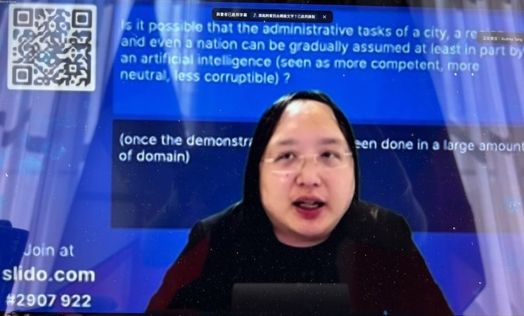 唐鳳演講運用線上互動系統Slido掃描QR Code進行匿名提問,並針對有關台灣數位發展願景、網路安全、個人資料保護法、資料隱私保護及開放應用的平衡點、參與式民主、人工智慧風險、電子化政府跨國合作及數位領域平權等學員提問一一回覆,交流問答熱絡,回饋相當正面。
