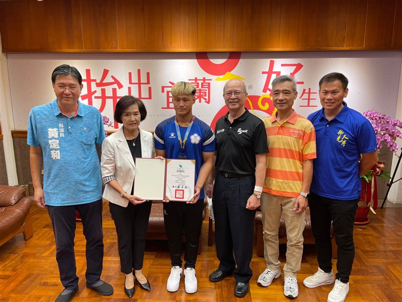 就讀佛大文資系的吳融政(左三),今年就榮獲「亞洲青年暨U23輕艇激流錦標賽」銀牌,優異表現獲宜蘭縣長林姿妙(左二)接見並頒獎。圖/佛大提供