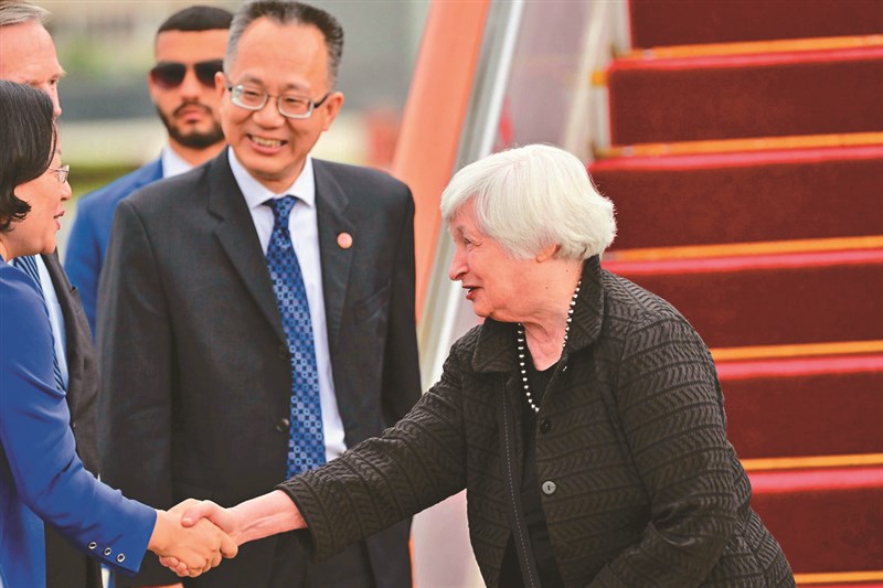 葉倫(右)首度以美國財政部長身分訪問中國大陸,訪期至九日,她搭乘的專機六日飛抵北京首都國際機場。中國財政部國際經濟關係司司長楊英明(中)前來接機。