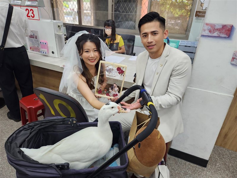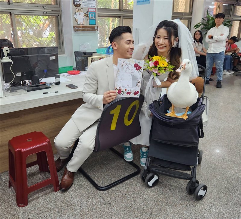 其中一對新人,蔡小姐和李先生是高中同學,愛情長跑6年,蔡小姐表示,今天是交往紀念日,也因她外號是「七七」,加上農曆又是520,特別選擇今結婚,她家裡是遊覽車業者,男方為追求她,努力考取遊覽車司機駕照,現在一人當司機、她則是當導遊。兩人還帶養寵物鴨來見證結婚,可愛模樣融化現場辦公民眾。
