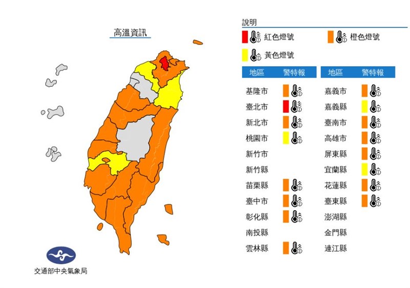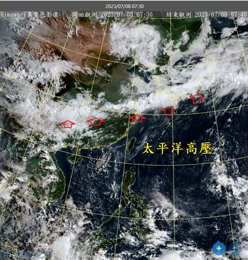 太平洋高壓影響 今日仍高溫炎熱 |2023.07.08 語音朗讀 1185觀看次 字級 大 中 小 8日太平洋高壓勢力仍強,加上西南風帶來暖空氣,各地區持續晴朗炎熱,高溫普遍可達35、36度以上。圖/中央社 【本報台北訊】中央氣象局長鄭明典在臉書表示,長江流域延伸到日本的梅雨鋒面雲帶,距離台灣很遠。台灣受到太平洋高壓影響,今(8)日還是熱、熱、熱。氣象局表示,今(8)日太平洋高壓勢力仍強,加上西南風帶來暖空氣,各地區持續晴朗炎熱,高溫普遍可達35、36度以上,特別是北北基地區、南部近山區及花東地區有37度以上高溫發生的機率。台北盆地及花蓮縱谷內有可能出現局部38度的極端高溫,東南部仍有機會出現焚風,中午前後紫外線指數可達過量至危險級,外出活動務必要做好防晒措施,並多補充水分。今(8)日目前為止最高溫出現在台東縣金崙,上午8時已有34.5度,其次是台東縣香蘭33.9度、台東縣太麻里33.8度、台北市台農院關渡站33.4度、新北市金山33.3度、宜蘭縣蘇澳33.2度。圖/取自鄭明典臉書降雨不多,只有山區午後有零星短暫雷陣雨;西南風偏強,苗栗以北沿海空曠地區及蘭嶼、馬祖易有較強陣風。今(8)日台北市地區為紅色燈號,有連續出現38度極端高溫的機率;新北市地區、花蓮縣地區為橙色燈號,有38度極端高溫出現的機率。基隆市地區、苗栗縣地區、台中市地區、彰化縣地區、雲林縣地區、嘉義市地區、台南市地區、高雄市地區、屏東縣地區、台東縣地區為橙色燈號,有連續出現36度高溫的機率;桃園市地區、嘉義縣地區、宜蘭縣地區為黃色燈號。圖/取自中央氣象局官網 前一篇文章 大台北、花東極端高溫 熱到周日 下一篇文章 路口不停讓行人取締件數增 較去年同期多4倍 熱門新聞 01【研朱札記】《臺灣文學》的 誕生地──山水亭2026.01.2702【古德傳法】永明延壽與衢州天寧禪寺2026.01.2103聯合國示警 全球水資源破產2026.01.2204【王文靜看世界】 「家庭主婦」凱薩琳 把美國總統逼下台2026.01.2105川普重返達沃斯論壇 將與歐磋商格陵蘭2026.01.2106吃素好體力 霍諾德登頂101 2026.01.2607金蓮淨苑三皈五戒 人間佛教扎根 2026.01.2108大馬佛光人進校園、社區 教急救知識2026.01.2109星雲大師全集【傳記】百年佛緣─社緣篇 黃金不動道人心─談我不為金錢誘惑的想法 4-22026.01.2110全球首座冰芯庫 守護冰川記憶2026.01.21 訂閱電子報 台北市 天氣預報 台灣一週天氣預報 相關報導 馬太鞍溪堰塞湖幾見底 降挖團隊撤離輝達星艦3.0 都市計畫變更通過嘉義山區步道 春季踏青首選跟著史努比 安全遊台中杉林溪 葉牡丹怒放天元宮聯名幾米 邀您一起賞櫻花