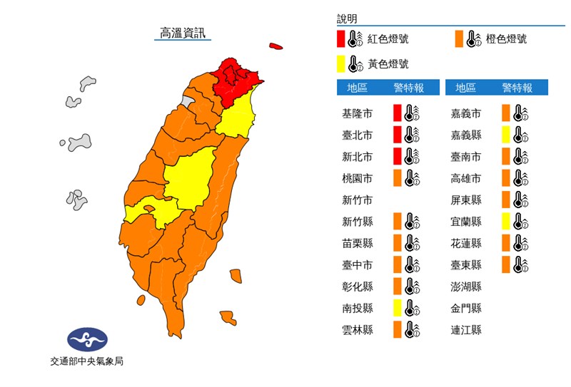 基隆市、桃園市、苗栗縣、台中市、彰化縣、雲林縣、嘉義市、台南市、高雄市、屏東縣、台東縣地區為橙色燈號,有連續出現36度高溫的機率;新竹縣、南投縣、嘉義縣、宜蘭縣為黃色燈號,也可能有36度高溫。