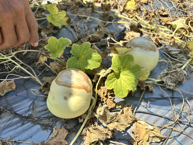 先前時常下雨導致瓜果敗根,近日又豔陽高照,交叉影響下,導致藤葉傾倒甚至枯萎,沒有葉子遮陽的情況下,瓜果晒傷更嚴重。圖/李文德