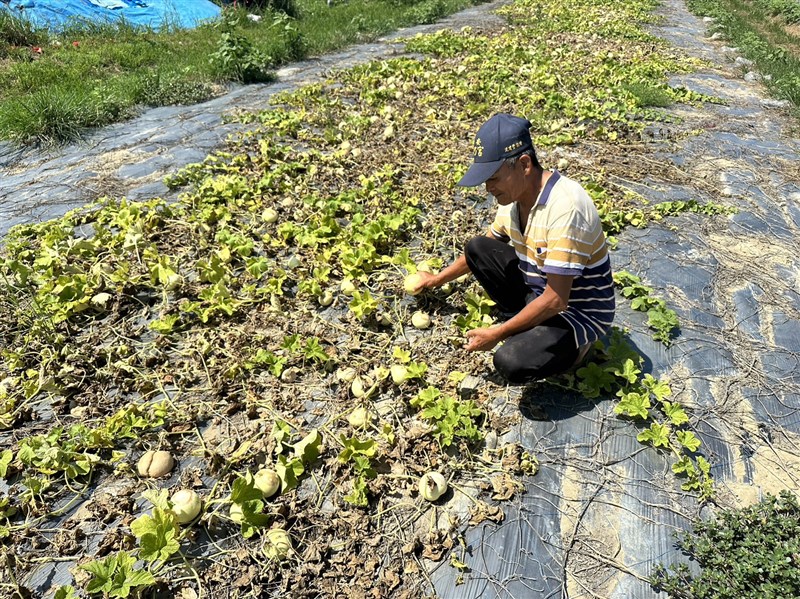 蔡姓瓜農說,自己種植近4公頃的香瓜。第一期收成近3萬公斤,不過第二期發現瓜果晒傷嚴重,採收後只能忍痛倒掉。損失接近一半,她無奈說「如果有第一期的一半以上就要笑了」。