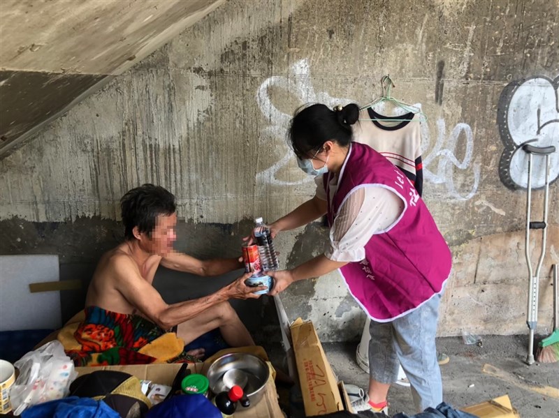 新北市街友外展服務中心到板橋湳仔一橋下關懷訪視街友,並送上礦泉水和八寶粥。圖/取自新北市政府社會局官網