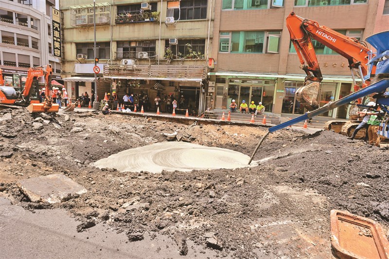 台北市南京西路、貴德街口路面出現塌陷,昨天塌陷的狀況擴大,台北市工務局等單位持續在現場灌漿處理。圖/許正宏