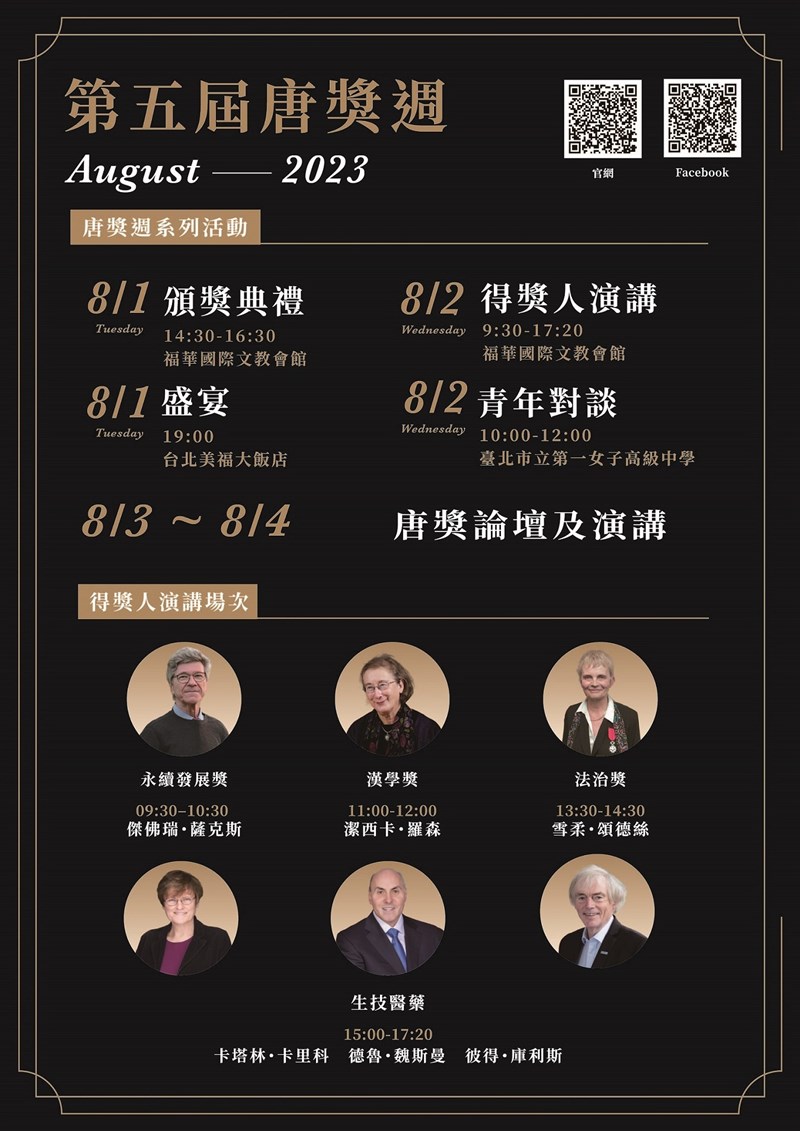 【記者吳亭頤台北報導】暌違5年,第五屆唐獎再度舉辦實體頒獎典禮,8月1日在台北登場,獎項包含永續發展、生技醫藥、漢學及法治,此次六位唐獎得主都將親臨台灣參加唐獎周活動。