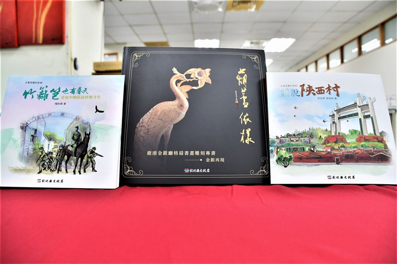 彰化縣府今天發表三本新書,包括鹿港金銀廳格扇書畫雕刻專書、大家來寫村史第52-53輯。圖/文化局提供