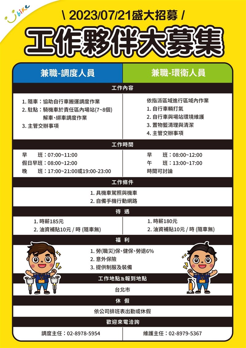 YouBike招募里民協助調度 時薪180至185元 |2023.07.13 語音朗讀 1138觀看次 字級 大 中 小 北市交通局13日表示,YouBike調度工作更加困難,因此希望招募各里熱心人士成調度人員,時薪新台幣180至185元,享勞健保及勞退6%。圖/資料照片 【本報台北訊】北市交通局今(13)日表示,隨著YouBike站點增多,加上微笑單車公司開調度車時,受路況影響調度;因此希望招募各里熱心人士成調度人員,時薪新台幣180至185元,享勞健保及勞退6%。交通局上午舉行「YouBike里民小幫手大募集」記者會表示,以往民眾反映無車可借或無位可還,需透過YouBike服務人員開調度車至現場運補自行車,調度時間易受路況所影響,且全市隨著站點數達1288站,調度工作更加困難。交通局表示,與微笑單車公司討論後,希望招募各里熱心人士成為調度人員,由微笑單車公司支薪,就近協助自行車搬運調度,並在指定責任區內場站、共有7至8個駐點,騎乘機車處理解綁車調度作業,及時提供給需要的民眾。圖/取自台北交通大家談臉書微笑單車表示,調度工作只有平面平移,例如把車從停滿的車柱移到調度區、再移到別的空車柱,不需要把車扛上扛下。微笑單車公司說明,里民小幫手工作時間可彈性排班,時薪180至185元並享勞健保及勞退6%,早班為7至11時、假日早班為8至12時、晚班為17至21時或19至23時,歡迎退休族、打工族或兼職族加入。民眾如果不確定自己體力能否負荷,21日10時至13時,在松德大樓1樓102會議室有體驗區,民眾可持身分證、機車駕照等資料填寫履歷表應徵。另外,考量站點數增多,為增加各站清潔頻率,同步招募YouBike環衛小幫手,負責場站自行車、置物籃和環境的清潔和維護,並協助自行車輛打氣,維護自行車的胎壓等。圖/取自台北交通大家談臉書 前一篇文章 北市民權大橋施工 7/15起內湖往松山改走便橋 下一篇文章 逾半上班族擔心AI應用取代自己工作 這個年齡層最憂心 熱門新聞 01瑕疵品反爆紅 哭哭馬賣到缺貨2026.01.1402日電鐵貴志站 任命第3代貓站長2026.01.1403南亞偏鄉師參學新馬寺 交流創意教學法 2026.01.1404平價版人類洗澡機 預計年底開賣2026.01.1405新馬寺 佛光兒童歡喜入學禮2026.01.1306重慶川普紅不讓 談旅遊給人歡喜2026.01.1407菲律賓三好校園頒獎 129校獲表揚2026.01.1308台南林鳳營 落羽松花海2026.01.1309【考考你的智力】2026.01.1210【人間風景】往事好回味2026.01.13 訂閱電子報 台北市 天氣預報 台灣一週天氣預報 相關報導 彩繪稻田 天后邸家姆明彩繪列車 搭中捷賞燈會護病比入法 藍綠各提版本後協商屏東燈節 光橋踏浪鼎昌號李宅 百年建築重生武陵農場低溫 吹起陣陣霧氣