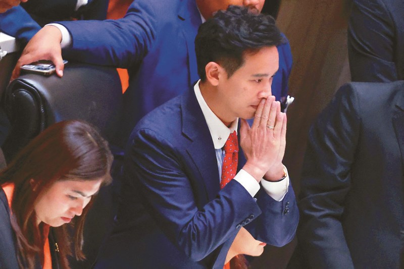 泰國國會總理選舉,熱門候選人皮塔(右)未能拿下過半席次,國會須在19日再次投票。圖/法新社