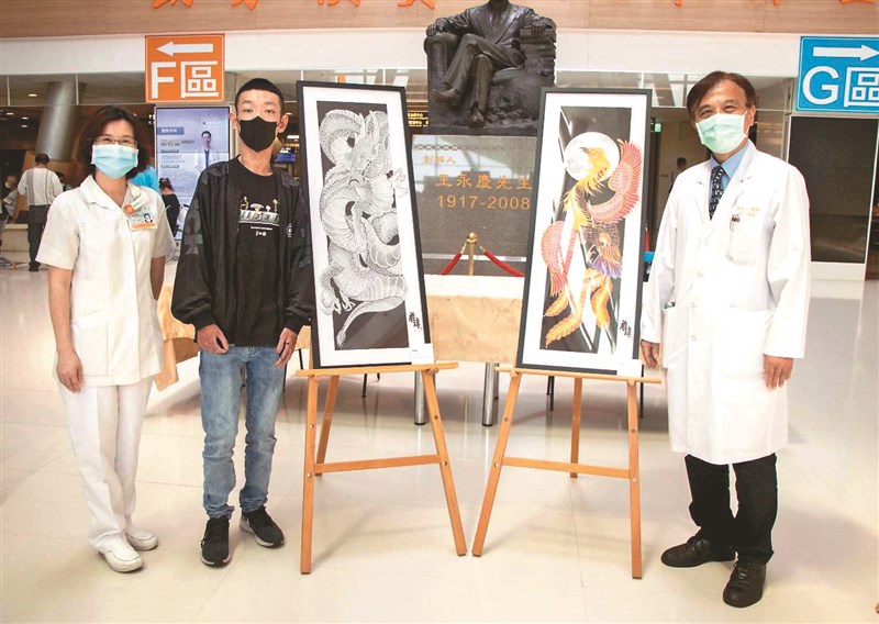罹患罕見皮膚病的張庭瑋(左2),即日起在嘉義長庚醫院辦理繪畫藝術創作展。圖/嘉義長庚醫院提供
