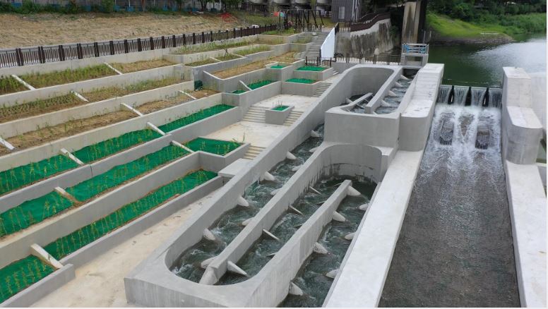 水利局長宋德仁表示,依據生態調查成果及相關條件綜合評估,新建的「豎槽斜隔壁水池式」魚道,加大暫留水池空間,調整坡度與流速。預估可提供20多種具溯游習性魚種回家的路。