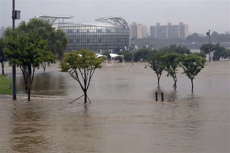 7月14日,南韓首爾拍攝被水淹沒的盤浦漢江公園。圖/新華社