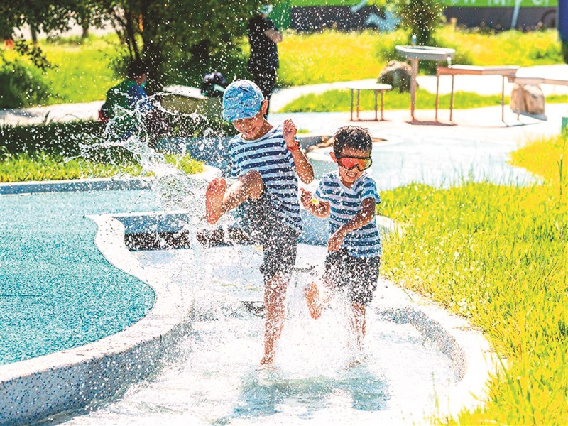 新北市首座機能型防災公園去年底誕生,鄰近安坑輕軌十四張站的「十四張歷史公園」有防災巧思,以農村水圳為意象,設置許多有趣的遊樂設施。水圳遊戲區調整開放時段,平日增為5場、假日調為11場,每場拉長為11分鐘,吸引孩子到公園戲水消暑。