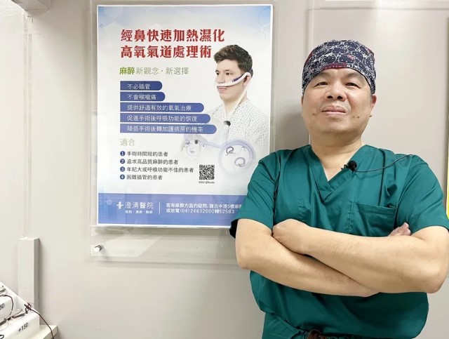 【本報台中訊】手術需要全身麻醉時一般都以插管進行,讓氧氣和麻醉氣體同時送進肺部,但澄清醫院中港院區麻醉科主任陳昭良在新冠疫情期間得到靈感,利用被譽為「救命神器」的高流量溼化氧氣經鼻導管系統供氧,再由靜脈打進麻醉藥劑,使氧與給麻醉藥物分流,讓病人的喉嚨和口腔組織不再因插管而受傷、不適。