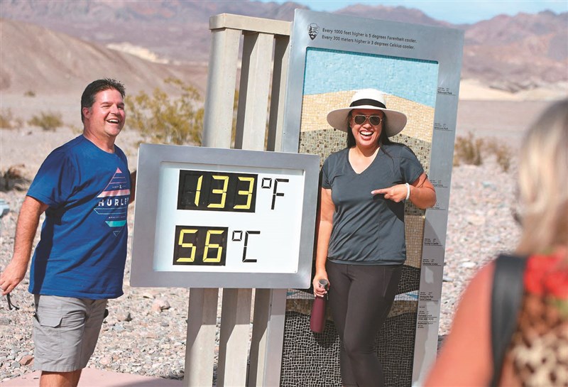 加州死谷16日溫度飆至56℃,遊客站在非官方溫度計旁拍照留念。圖/法新社