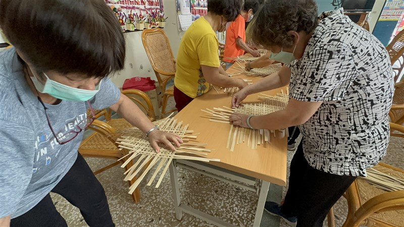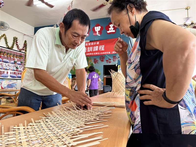 竹編大師張永旺(圖左)受關廟區公所邀請,到五甲里親自授課讓學員竹編圓餅盒。圖/李文德