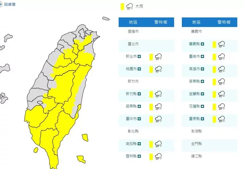大雨特報範圍:新北市山區、桃園市山區、新竹縣山區、苗栗縣山區、台中市山區、南投縣山區、雲林縣山區、嘉義縣山區、臺南市、高雄市、屏東縣、恆春半島、宜蘭縣山區、花蓮縣山區、台東縣、蘭嶼綠島。