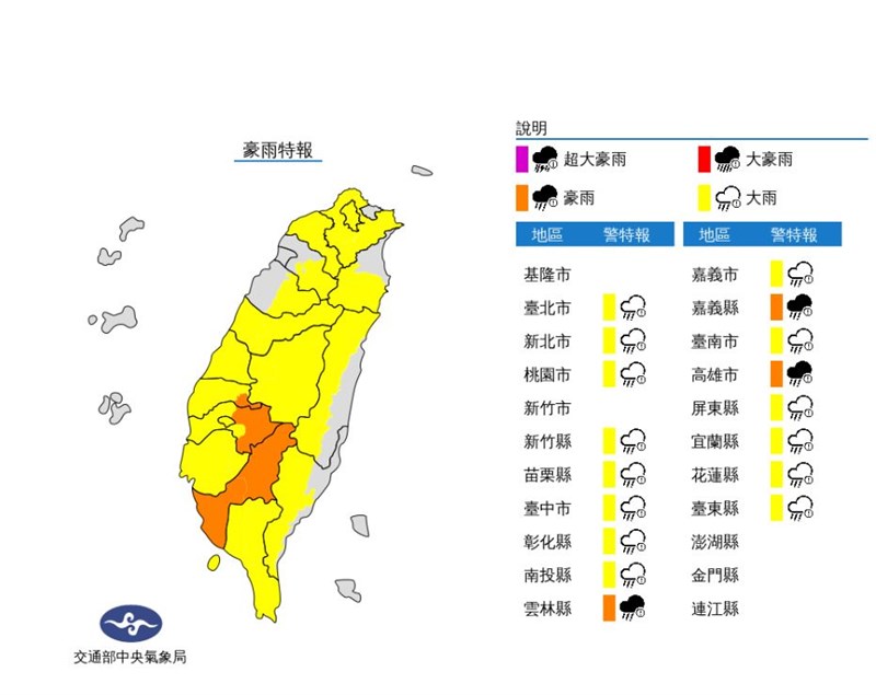 17縣市發豪雨特報 慎防致災性降雨 |2023.07.20 語音朗讀 965觀看次 字級 大 中 小 氣象局針對17縣市發布豪雨特報,並提醒民眾慎防劇烈降雨、雷擊等。圖/中央社 【本報台北訊】氣象局針對17縣市發布豪雨特報,並提醒民眾慎防劇烈降雨、雷擊、溪河水暴漲、坍方、落石、土石流及低能見度。氣象局發布豪雨特報,午後對流雲系發展旺盛,易有短延時強降雨,今(20)日高雄市及雲林縣、嘉義縣山區有局部大雨或豪雨;大台北、桃園、中南部地區及新竹、苗栗、東半部山區有局部大雨發生的機率。氣象局提醒,注意雷擊和強陣風,山區請慎防坍方及落石,低窪地區慎防積水。圖/取自中央氣象局官網 前一篇文章 世界展望會推「齊飢體驗車」 邀民眾體驗救援 下一篇文章 板橋冷氣掉落砸路人喪命 新北勞工局勒令停工 熱門新聞 01銀杏點亮.東京印象2025.12.2302【獻給動物朋友的詩】 最可愛的動物詩路2025.12.2503【守護家人】 為愛築家2025.12.2304北捷英雄捨身救人 母盼菩薩接引2025.12.2305以法相聚 佛光山員義工歲末聯誼2025.12.2406社論--悲憐天下父母心2025.12.2507台北道場歲末聯誼 感謝義工同行菩薩道2025.12.2708【寰宇采風】京都最溫柔的秋色:紅葉永觀堂2025.12.2609奧斯汀佛光人 感謝警消守護2025.12.2410南天寺英文佛學營 佛青培養內在力量2025.12.24 訂閱電子報 台北市 天氣預報 台灣一週天氣預報 相關報導 冬候鳥大麻鷺 現蹤東沙環礁棘冠海星暴增 威脅珊瑚日月潭環湖車道 美景環抱機車考照變難 筆試改全選擇題元旦迎曙光 氣象署:成功率偏低今年最後一波冷氣團來襲 明天起回暖