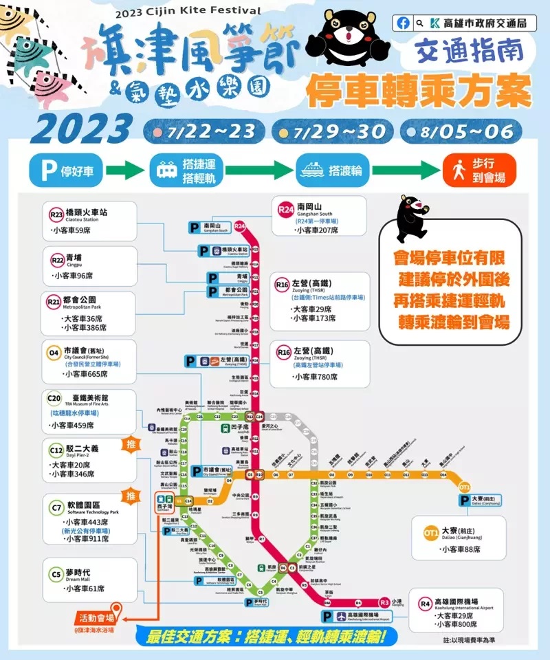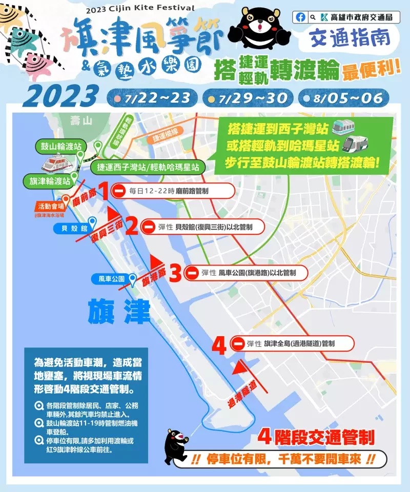 旗津風箏節明登場4階段交管 騎機車遊客禁止上渡輪 |2023.07.21 語音朗讀 793觀看次 字級 大 中 小 2023旗津風箏節22日登場,高市交通局將實施4階段交通管制,呼籲大眾盡量搭渡輪,避免塞車或找不到停車位。圖/高雄市觀光局提供 【本報高雄訊】2023旗津風箏節明(22)日登場,今年首創陸海空3D展演,預計吸引大批民眾湧入旗津,高市交通局將實施4階段交通管制,呼籲大眾盡量搭渡輪,避免塞車或找不到停車位,活動期間每天上午11點至下午7點尖峰時段,除旗津居民、公務機車、電動機車及自行車不受管制外,遊客騎乘的燃油機車禁止登船。高雄市觀光局表示,今年旗津風箏節從7月22日起到8月6日,連續三個周休假日舉行,創全台活動時間最長紀錄,周周都都有不主題式展演,也首創陸海空3D展演,有翱翔天際的巨型風箏、供民眾拍照的地景裝置風箏及開幕日的海衝浪風箏,別開生面。觀光局長高閔琳表示,白天有主題風箏展演,周末晚則加碼夜光風箏、周日晚上有酷炫火舞表演出,另搬來直徑26公尺大的巨無霸戲水池、65公尺長的城市滑水道、手搖船水池及旋轉木馬、旋轉熱氣球等遊具,讓小朋友消暑暢快。圖/王昭月活動期間將實實施四階段交管,除加密渡輪班次,旗津區內也安排定點接駁服務,另為提升渡輪輸運效率,活動期間每天上午11點至下午7點尖峰時段,除旗津居民、公務機車、電動機車及自行車不受管制外,遊客騎乘的燃油機車禁止登船。交通局表表示,配合旗津風箏節暨氣墊水樂園活動,會執行4階段彈性交通管制,其中第四階段為全島管制,過港隧道將自前鎮端入口即實施交通管制。交通局建議市民多利用捷運、輕軌轉乘渡輪前往活動會場,民眾可搭捷運至橘線O1西子灣,或搭乘輕軌至C14哈瑪星出站至鼓山輪渡站,再轉渡輪抵達旗津輪渡站後,步行至會場。配車流疏導,踩風大道機動開放南下小客車單行管制措施,減緩離場車流壅塞。圖/王昭月 前一篇文章 24日萬安演習部分交通管制 桃機籲旅客提早到機場 下一篇文章 因應萬安演習 foodpanda這4天依地區暫時關閉 熱門新聞 01【遨遊藝事】 威尼斯沉船書店2025.12.2902【中醫專欄】 中醫防失智之道2025.12.2703【寰宇采風】京都最溫柔的秋色:紅葉永觀堂2025.12.2604台北道場歲末聯誼 感謝義工同行菩薩道2025.12.2705南瓜籽紅豆黑芝麻 含天然助眠營養素2025.12.2606新馬寺率大馬校長團 訪佛光大學2025.12.2707世界神明聯誼會 佛神共祈和平2025.12.2608宜蘭7.0地震 921後第3強震2025.12.2909橫山書藝雙年展 書法從案頭到街頭2025.12.2610看人間 厭童、厭老,然後呢?2025.12.30 訂閱電子報 台北市 天氣預報 台灣一週天氣預報 相關報導 政府撥補勞保法制化 立院三讀 花在彰化防隨機攻擊 交長:1月底聯合演練環境部擴大減塑 納零售、網購包裝桃園珍珠海岸 列入後湖溪生態園區冬候鳥大麻鷺 現蹤
