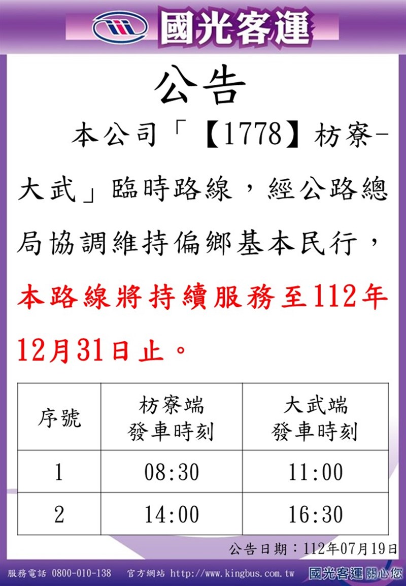 台東縣政府表示,原本台汽國光客運是要全面停駛台東所有路線,但考量南迴大武及達仁鄉親仍有至屏東縣枋寮就醫需求,經爭取台汽同意保留大武路線,未來若有需求會再爭取復駛。