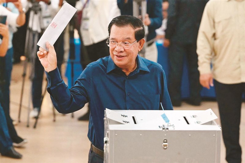 柬埔寨二十三日舉行大選,預料強人總理洪森領導的柬埔寨人民黨將勝選。圖為他當天在干丹省一處投票所投票。圖/法新社