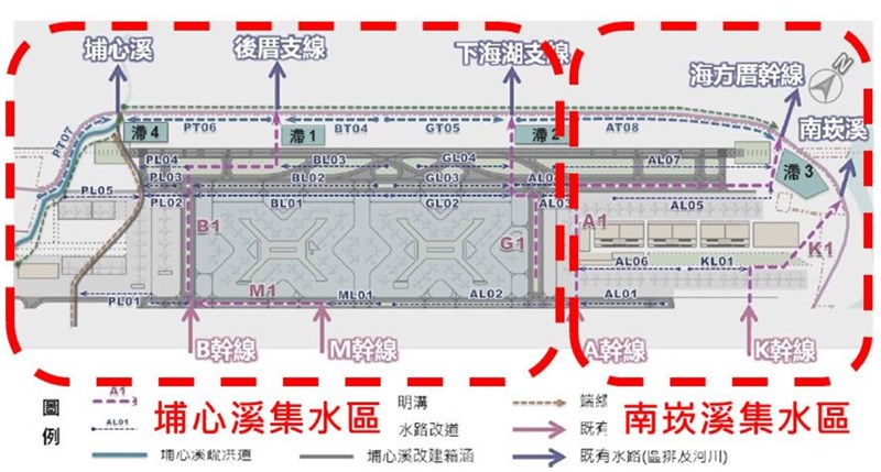 桃園市政府進行埔心溪及南崁溪整治,將防洪標準提升至100年暴雨不溢堤,開發單位表示,位於第三跑道內之原渠道流量可由原規畫疏洪道承受,因此機場段將採單一渠道設置,另外相關水系防洪能力已提升並納入本案開發後逕流量,因此將取消第三跑道上之四座滯洪池。