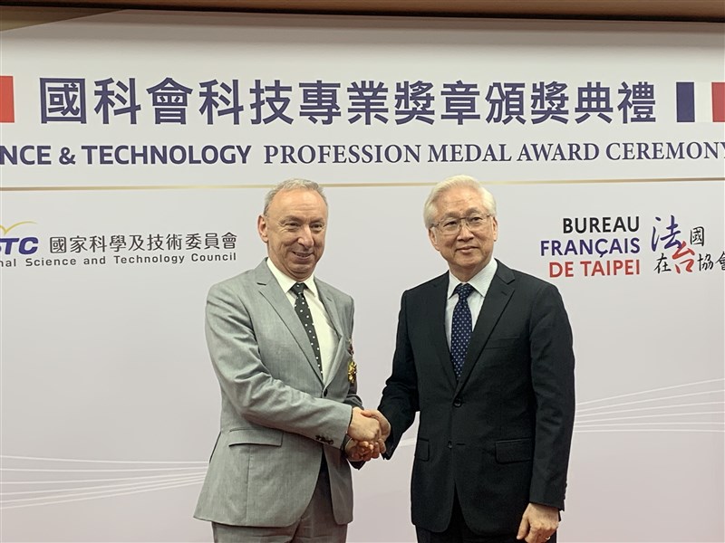 【記者吳亭頤台北報導】行政院國家科學及技術委員會今 (25)日頒贈科技專業獎章給法國在台協會主任公孫孟,目前他已完成階段性任務,即將離開台灣,由國科會主委吳政忠代表頒發獎章,感謝公孫孟推動台法雙邊科技合作。