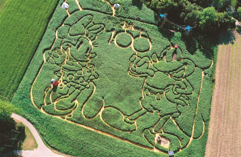 位於德國南部巴伐利亞邦的村落烏廷(Utting),有一座迪士尼卡通角色「米奇」和「米妮」打造而成的植物迷宮;占地約1672平方公尺,由向日葵、麻、玉米、野錦葵、觀賞用南瓜和豆類等約36萬株植物所構成,其中步道共計約3.2公里。迷宮開放至9月24日。圖/法新社