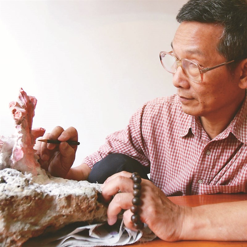 為了傳承珊瑚文化,賴榮興一九九九年成立珊瑚法界博物館,圖為賴榮興專注雕刻紅珊瑚。圖/賴元淵提供