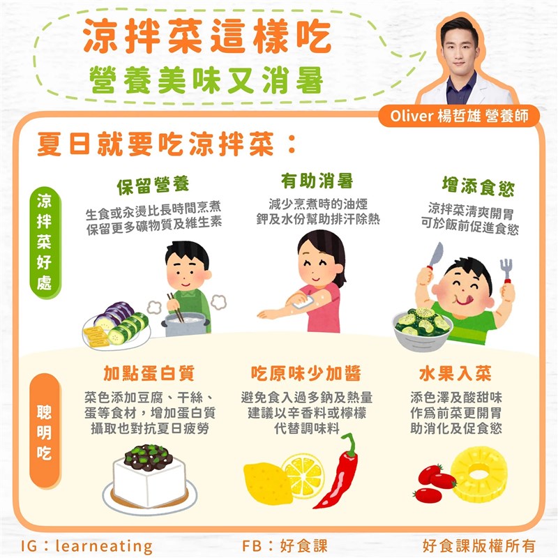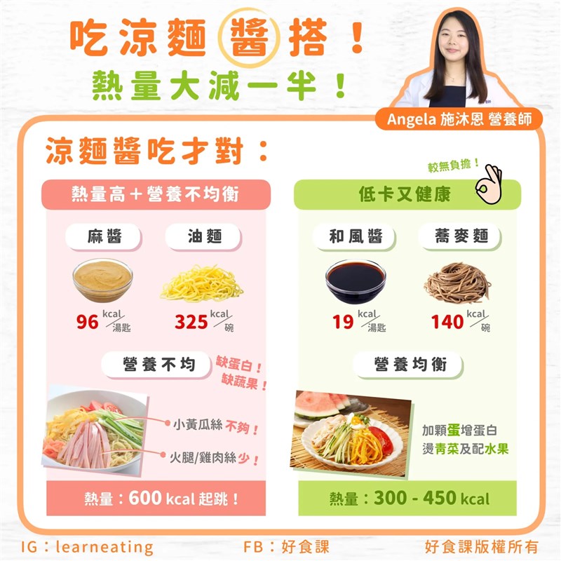 涼麵、涼拌菜這樣搭 消暑又健康 陳玲芳 |2023.07.26 語音朗讀 2210觀看次 字級 大 中 小 美味的「涼麵」與「涼拌菜」,要如何吃的「低卡又健康」?營養師提示許多搭配、選擇重點,包括將「油麵」改成「蕎麥麵」,可減少熱量、增加膳食纖維量。圖/pexels 【記者陳玲芳台北報導】炎炎夏日,常常天氣熱到沒胃口、吃不下,這時大家就會選擇冰冰涼涼又美味的「涼麵」或是「涼拌菜」。但是,要如何吃的「低卡又健康」,也是大家會在意的重點。「好食課」營養師陳葳、施沐恩、楊哲雄三人,特以QA方式,分享如何將涼拌菜吃的更營養健康,以及選擇涼麵配料的小技巧。Q1:涼麵配料怎麼選?A1:選擇「蕎麥麵」代替油麵油麵一碗(90克)熱量約325 kcal,同重量的蕎麥麵,不僅大大減少碳水化合物的量,膳食纖維量也相較於油麵高,不僅可提供飽足感,熱量僅有140 kcal,是油麵的一半而已,透過選擇不同麵條,更可以省下許多熱量!A2:選擇「和風醬」代替麻醬麻醬一湯匙的熱量高達96 kcal,一碗麻醬涼麵如,果加了4湯匙,就增加近400 kcal的熱量,但如果將醬改成和風醬,熱量則可大大降低5倍。圖/好食課提供A3:配料增加「蛋」、青菜或水果一般涼麵,常常僅有一些小黃瓜及雞絲作為點綴,整體蛋白質及膳食纖維量非常不足。建議於吃涼麵時,加上一顆蛋,並搭配燙青菜或水果,使得營養更均衡。Q2:涼拌菜有什麼好處?A1:保留「營養」價值涼拌菜的製作及食用,多以「汆燙」及「生食」為主,比起長時間加熱烹煮炒炸的蔬菜,保留了更多的鉀、鎂等礦物質及維生素C。A2:有助於「消暑」製作涼拌菜,除了免去於廚房開大火,製造一堆油煙以外,涼拌蔬菜中的「鉀」及「水分」,也可幫助排汗散熱。圖/好食課提供A3:增添「食欲」夏天一熱,容易喪失食欲,涼拌菜清爽開胃,作為飯前的開胃菜,正好可以促進食欲。Q3:涼拌菜配料如何選擇?A1:添加「蛋白質」可將豆腐、豆干、干絲、毛豆、雞蛋等食材入菜,增加蛋白質攝取,使整體的飲食更均衡。A2:吃「原味」少加醬很多人吃涼拌菜,會淋上醬油膏或胡麻醬來調味,但這樣不僅吃進額外的熱量,也同時吃進不少「鈉」,建議可以以檸檬汁或辛香料如薑泥、辣椒等天然食材,來幫助提味並減少負擔。水果入菜,可以幫忙增添色澤及一些酸甜味,以刺激食欲、也助消化。圖/pexelsA3:「水果」入菜水果,可以幫忙增添色澤及一些酸甜味,以刺激食欲、也助消化。另外,也可以增加維生素礦物質及膳食纖維的攝取,使涼拌菜吃得更營養豐富。總結來說,透過正確的食物搭配、選擇,不僅可以在炎炎夏日中享受美食,更可以讓你吃得營養又健康。 前一篇文章 長期睡眠呼吸中止 恐增中風機率 下一篇文章 病友化身藝術家 展出美麗「心」世界 熱門新聞 01屏東.春日 太陽之子南島風 陶壺印記排灣情2026.01.2602【研朱札記】《臺灣文學》的 誕生地──山水亭2026.01.2703吃素好體力 霍諾德登頂101 2026.01.2604【閃文集】獨特自主的貓咪2026.01.2705【獻給動物朋友的詩】站成蘭花的螳螂與嘗到幸福滋味的蜂2026.01.2906【傳燈六十‧百年仰望】星雲大師一筆字書法紀念特展概述2026.01.3007大明寺熱粥傳祝福 鍾東錦致謝2026.01.2708【詩】樂山大佛垂淚2026.01.2609馬太鞍溪堰塞湖幾見底 降挖團隊撤離2026.01.2710【時代顯影】愛與勇氣的 溫頓列車2026.01.26 訂閱電子報 台北市 天氣預報 台灣一週天氣預報 相關報導 慢性失眠 醫:1 / 3 與情緒、壓力有關春節前備妥常用藥品 指示用藥需諮詢藥師保鮮盒防殘留油汙 洗前紙巾擦拭預防胃癌 推公費篩檢幽門桿菌每周一杯綠茶、咖啡 有助降低鼻咽癌風險 亞洲首座心衰中心 亞東醫院獲認證 作者其他文章預防胃癌 推公費篩檢幽門桿菌亞洲首座心衰中心 亞東醫院獲認證冬季養生早睡晚起 多晒太陽改善淺眠園藝療癒 台北101展蕨蘭之美公費肺鏈疫苗升級 65歲長者速接種台大古蹟藥局自動化 效率升級