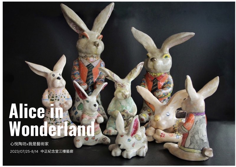 本次展覽特色之一,是心悅陶坊分為愛麗絲夢遊「心」境以及「碰撞工作坊」兩大主題區;藝術家阿德,創作出充滿童趣、幻想的兔子,引領人們進入這群藝術家的「心」世界,就像愛麗絲跟隨戴著懷錶的兔子,進入到樹洞中,探索新世界那般「心」奇。
