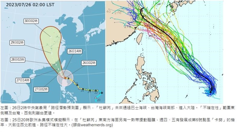 吳德榮指出,最新中央氣象局「路徑潛勢預測圖」顯示,「杜蘇芮」並未如氣象局預測於昨晚增強為「強烈」,仍為「中颱」上限,未來通過巴士海峽、台灣海峽南部、進入大陸。「不確定性」範圍東側觸及台灣,西側則離台更遠。