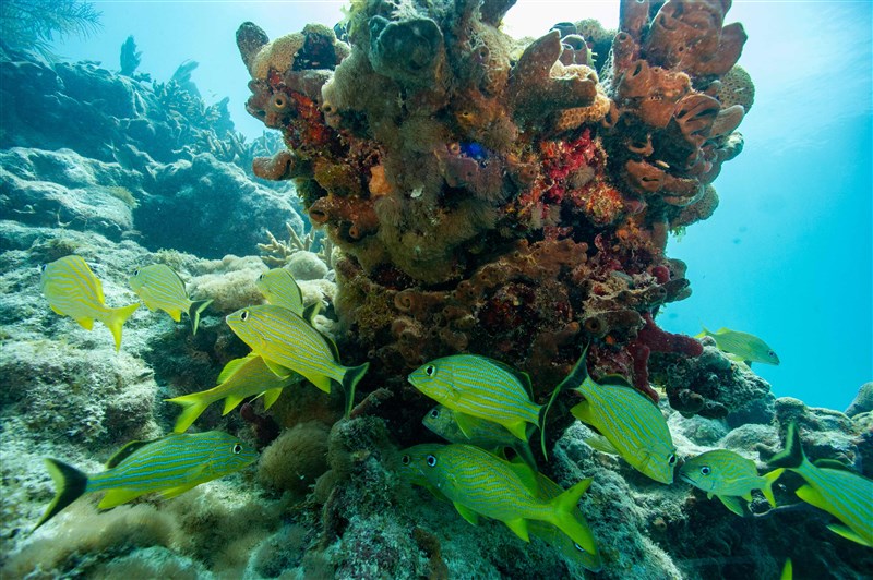 美國南佛羅里達州一處淺水灣的水溫26日突破華氏100度(攝氏37.8度)大關,這樣的氣溫威脅著海洋生物,先前於2015和2019年間的熱浪期間,約有50個物種滅絕,包括珊瑚和軟體動物。圖/法新社