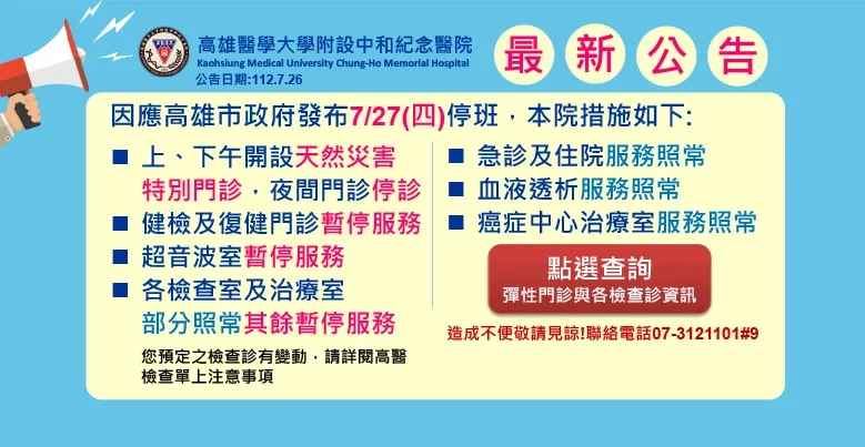 ⭕️開設天然災害彈性門診,健康管理中心、復健門診、超音波室全日暫停服務,⭕️血液透析室服務照常,急診與住院亦全日照常服務。門診預約的病友如無法如期就醫時,院方可協助一個月內加掛。