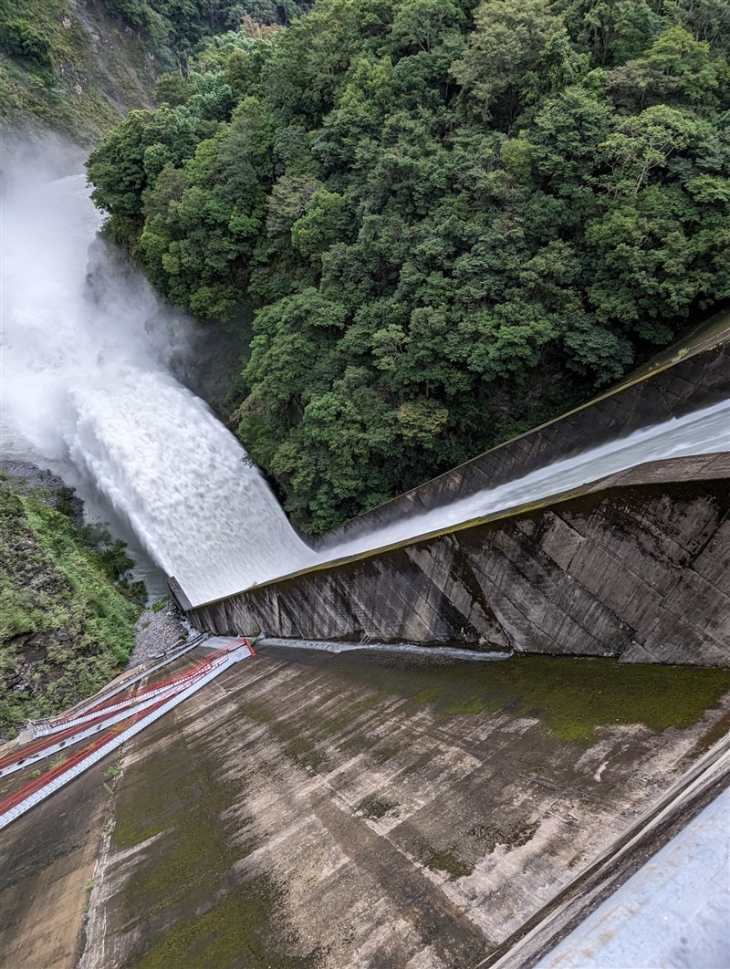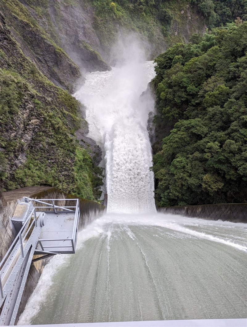 廠長黃陵育表示,今天霧社水庫距滿水位只差3公尺,儲水率83.16 %,但入流量每秒約180公噸,進行洩洪中,扣除發電用水46公噸外,機組發電量約4萬瓩,排洪量每秒150公噸,藉保持霧水水庫水位保持穩定。
