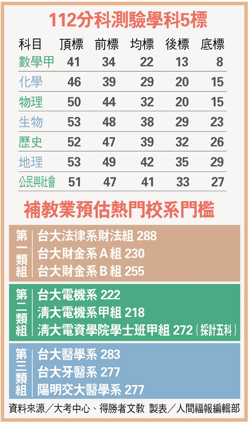 升學輔導老師預估,今年台大醫學系預計錄取門檻為283級分;2類組台大電機預計222級分;1類組台大法律財法組288級。