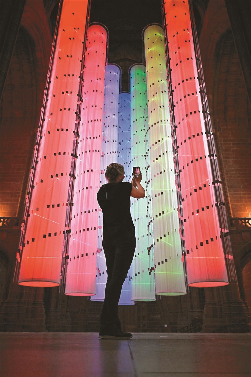 雕刻家彼得.沃克創作的藝術品〈身分〉(Identity),27日安裝於英格蘭西北部利物浦的利物浦大教堂時,有人正拿著手機拍照。