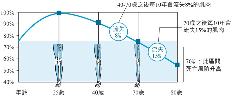 正視肌肉衰減症 文/白小良(美國紐約市立社區大學兼任助理教授) |2023.07.29 語音朗讀 1663觀看次 字級 大 中 小 肌肉衰減的主要治療方法之一是運動,特別是阻力訓練或重力訓練(強力運動)。圖/123RF圖2:肌肉質量隨著年齡流失:30歲之後每10年流失3-8%的肌肉,40-70歲之間每10年流失8%的肌肉,70歲之後每10年流失15%的肌肉。圖/時報出版提供圖1:正常vs肌肉衰減症的肌肉。圖/時報出版提供 文/白小良(美國紐約市立社區大學兼任助理教授)肌肉衰減症會對年長者的健康造成威脅,肌肉量的多寡,是影響年長者死亡風險高低的關鍵之一。雖然肌肉衰減是老化的自然現象之一,但還是可以靠著「正確的飲食習慣」和「規律運動」減緩肌肉流失速度。因跌倒導致骨折,大多數人會立即歸咎於骨質疏鬆症,卻忽略了肌肉衰減帶來的影響。以往對因老化隨之而來的慢性疾病以「三高」(高血壓、高血糖、高血脂症)為主,但近年來醫界注意到年長者肌肉衰減症的嚴重性已不小於三高。肢體肌肉對身體的功能性活動非常重要,例如從椅子上或車內座椅起身站起來、爬樓梯、提物品、抱孩子都需要肢體肌肉來主導。當肢體骨骼肌肉量與強度逐漸流失,會出現活力降低、身體變得虛弱、四肢功能下降、容易跌倒等,進而影響生活品質,甚至死亡。普遍認為「健身」是年輕人為了追求外貌塑身所從事的重量運動,和年長者無關。事實不然,鍛鍊肌肉絕不是年輕人的專利,年輕人的健身著重在上半身肌肉的塑造;而年長者更需要強健的肌肉質量來維持健康生活品質,尤其是腰部以下和下半身腿部的肌肉,務必避免肌肉量和功能的喪失。肌肉量多寡影響死亡風險「肌肉衰減症」是一種漸進性和全身性的骨骼肌肉流失,肌肉內細胞數量減少,所引起的一種緩慢退化過程。原因很多,包括運動神經元和肌肉纖維減少、合成代謝阻抗、肌肉再生受損(蛋白質的分解超過合成)、慢性低度炎症及睪丸激素降低等。肌肉衰減症盛行率會隨著年齡增加而上升,因此被定義為與年齡相關的骨骼肌質量和強度的非自願性喪失。其症狀包括肌肉強度和活動力下降、容易疲憊、身體機能差、無意識體重減輕。經常有人指出「衰老由腳開始」,步履蹣跚確實是衰老過程中肌肉衰減的明顯表徵。肌肉衰減症會對年長者的健康造成威脅,肌肉量的多寡,是影響年長者死亡風險高低的關鍵之一。肌肉衰減症除了容易跌倒,導致骨折,還有可能引發慢性疾病。台灣國家衛生研究院曾公布一項研究報告,全台灣每四名六十五歲以上年長者,就有一人因肌肉量不足,導致罹患高血壓、心臟病等慢性病的死亡風險,較同齡者高出近一倍。因此肌肉量是年長者對抗慢性病的本錢,若肌肉量不足,免疫力也會變弱,使得年長者更禁不起疾病的威脅。不僅年長者有肌肉衰減人體從出生到三十歲左右肌肉會變得愈來愈多、愈來愈強壯;但過了三十歲左右之後,肢體肌肉每年大約流失百分之一,這稱之為「肌肉衰減」。尤其是沒有運動習慣的人,其後每十年可能會減少多達百分之三到八的肌肉量。即使有運動習慣,仍然會有肌肉損失,只是比例較少、速度較慢(見圖1)。步入中年之後,身體組成會有明顯的變化,最明顯的是身體總蛋白質量減少。其中骨骼肌肉的衰減最為顯著。證據證明早在四十歲左右開始,骨骼肌質量和強度會明顯下降,到八十歲左右會流失多達百分之五十的質量。通常在七十五歲左右急速發生,但也可能提早在六十五歲或延遲至八十歲時加速(見圖2)。不僅是年長且瘦弱的人會有肌肉衰減症,許多體重超重或肥胖的人也有肌肉衰減症,因為體脂肪多,在視覺上不易察覺,但在功能活動上顯得虛弱。肌肉萎縮和肌肉衰減在定義上有所不同,肌肉萎縮是持續的不運動後(例如受傷後因使用支架加以固定),導致整個肌肉細胞流失。年長者肌肉衰減症的因素肌肉每天都不斷地在進行「分解」和「合成」,兩餐之間,尤其是飢餓狀態時,肌肉分解率較高,反之進餐後肌肉合成率較高,年長者在用餐之後肌肉的合成率較年輕人低。據研究,全身蛋白質組織轉換率一般為百分之三十,七十歲時轉換速率會下降到百分之二十或更少。此外,年長者在咀嚼和吞嚥上較困難,間接導致不易從飲食中攝取足夠的蛋白質。再者,一九七○年後營養、醫學及流行病學上不斷提出研究證據,顯示動物性食物因為含有較高量的飽和脂肪和膽固醇,與心臟血管疾病、肥胖、癌症等慢性疾病的形成有關,而這些慢性疾病普遍存在年長族群中,導致許多年長者無形中試圖減少飲食上蛋白質的攝取。當蛋白質攝取的量和質都無法補足兩餐之間的肌肉分解,日復一日體內的肌肉蛋白持續流失,會使得體力下滑、失去皮膚彈性、免疫功能下降,無法抵抗感染、傷口癒合不良,且生病時的恢復能力減弱。運動可以減緩肌肉衰減雖然肌肉衰減是老化的自然現象之一,但還是可以靠著「正確的飲食習慣」和「規律運動」減緩肌肉流失速度。肌肉衰減的主要治療方法之一是運動,特別是阻力訓練或重力訓練(強力運動)。這些活動使用重物或阻力帶增加肌肉力量和耐力,幫助肌肉神經系統發育,並刺激激素,例如生長激素合成和分泌。規畫阻力運動時需特別注意進行的次數、強度和頻率,如何在最低的受傷風險中獲得最大的益處。年長者尤其重要的是腿部和腰部的肌肉,鍛鍊腰力、腿力可以預防跌倒,也能