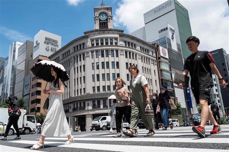 日本警察廳統計,全境到今年6月止,上半年交通事故死亡人數1182人。圖為民眾撐傘遮陽走在日本街頭。圖/法新社