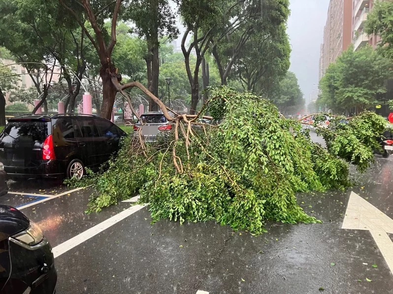 北區太原路今下午5點多路樹倒塌,砸到街邊1輛小客車所幸無人受傷。圖/曾健祐