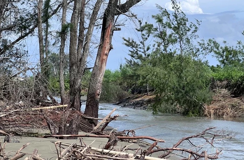 台南沿海地區沙灘、沙洲流失嚴重,海岸線倒退2、300公尺,嘉義林管處在北門雙春南側海岸線放置太空包,保護沙洲、防風林,水利署第五河川局則有養灘保護工程,但仍不敵颱風強襲,這次暴潮竟然從南側沙洲沖出寬約12公尺、長達80米的大缺口,漲潮時海水可直抵雙春遊憩內的紅樹林保護區。