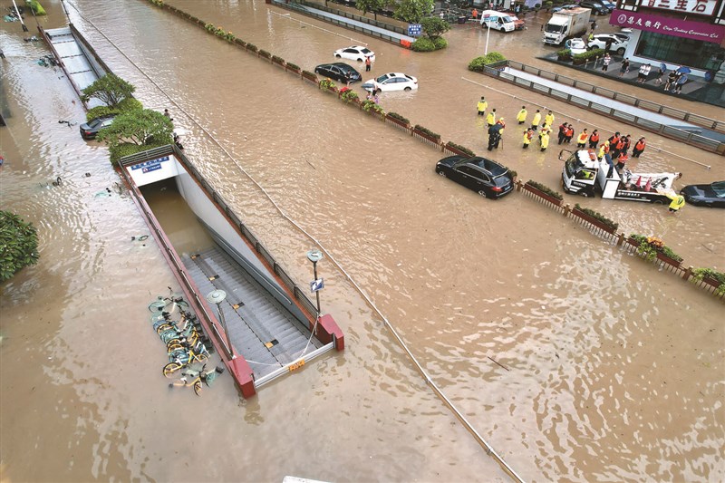 杜蘇芮颱風侵襲中國大陸福建省,29日從空中俯瞰福州市五四路,宛如一片汪洋。圖/中新社