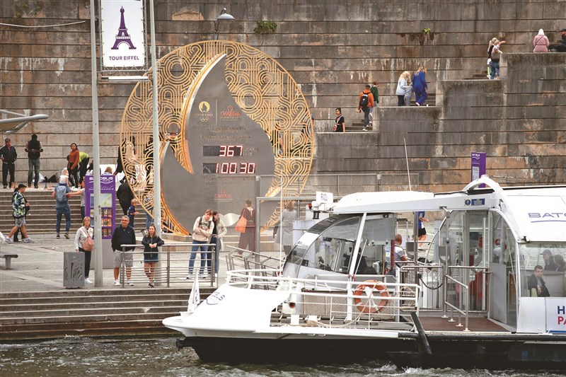 法國巴黎塞納河畔碼頭上,大型時鐘正倒數計時明年巴黎奧運開幕時間。圖/新華社