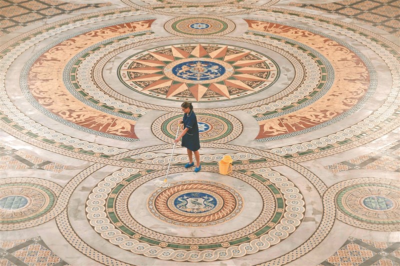 英格蘭西北部利物浦的聖喬治廳(St. George's Hall)中,設有由3萬片「明頓」(Minton)瓷磚拼成的地板,上頭繪有不同的神話生物和利物浦的紋章,最初鋪設於該建築興建的1852年。8月1日至18日,這些瓷磚會繼2019年以來首度公開展示。圖/法新社