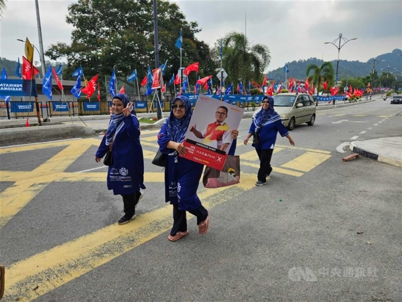 馬來西亞即將舉行6州選舉,朝野陣營於29日提名日後展開競選,圖為支持團結政府選民手持候選人牌子行經雪蘭莪州鵝嘜雙溪布蘇國民中學提名中心。圖/中央社