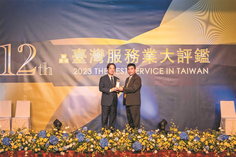 永慶房屋總經理吳良治(右)從副總統賴清德(左)手中,接過2023台灣服務業大評鑑連鎖房仲業服務金獎獎座。