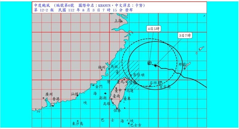 中颱卡努以每小時5轉9公里速度向西轉東北進行。圖/取自氣象局網站